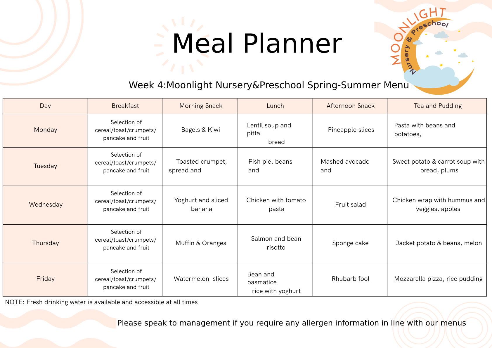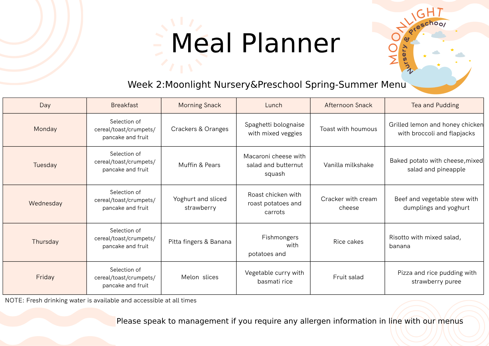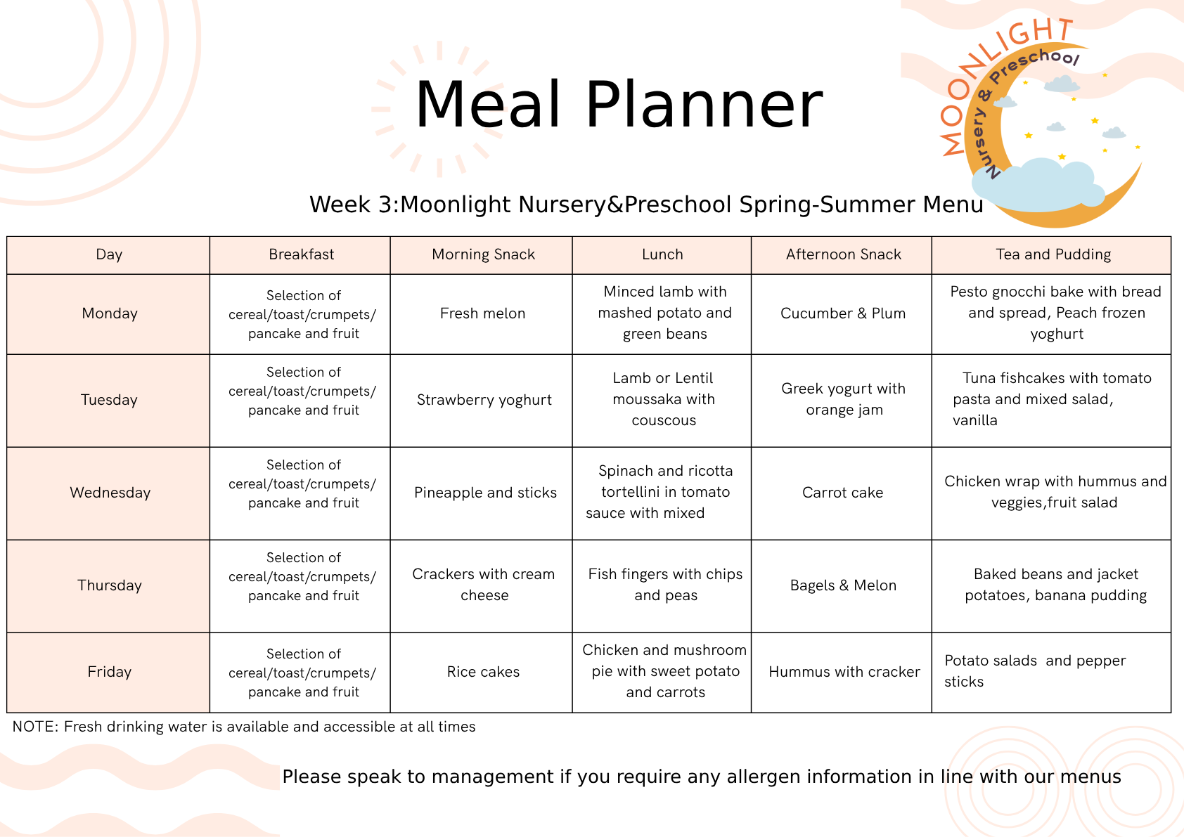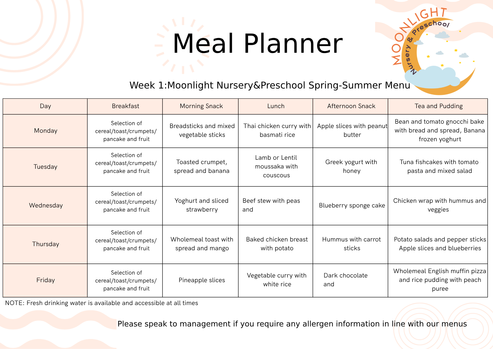 At Moonlight Nursery and Pre-School, we believe that healthy eating is the foundation of a happy and energetic childhood. That’s why our menu is carefully designed to provide balanced, nutritious, and delicious meals every day. We serve five meals daily, ensuring your child is fueled for play, learning, and growing throughout their time with us. Every meal is thoughtfully prepared with seasonal ingredients, ensuring a balance of taste and nutrition.